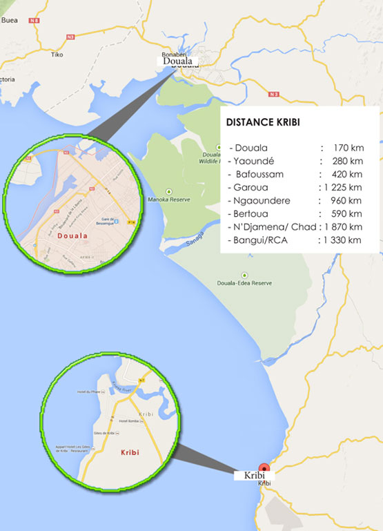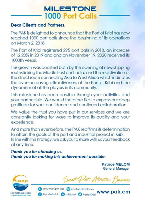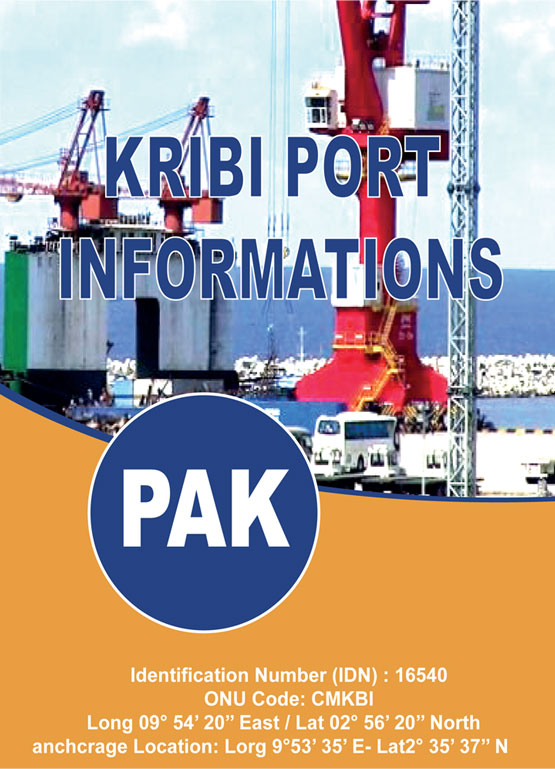 PORT OF KRIBIMANAGEMENTChair of the Board of Directors: Jean Paul SIMO NJONOUGeneral Manager: Patrice MELOM Deputy General Manager: Harouna BAKO Other Port Authorities Harbor Master : Bertrand NDI MENDUGENA Email: bertrand.ndi@pak.cm - Mob. : 637 421 940 Operation Manager : Michael MAMA AWOUMOU Conseiller Technique N°1 : Modeste Jocelin AKOO Contact P. O. Box: 203 Kribi-Cameroun Tel: (237) 242 653 033 / Fax: (237) 222 235 340 Email: contact@pak.cm www.pak.cm PORT LOCATION - Located 35 km from the town of Kribi in the locality of Mboro. - Built on a net surface area of about 24 ha. - Backed by a land reserve of more than 26,000 ha. - Surrounded by countries of the hinterland to the East side of the Atlantic Ocean, in the Gulf of Guinea, thus placing the country at the heart of North-South maritime lines. PORT TYPE - Deep-sea port connected to the sea by a 650 metre long. - 200 metre wide and 15 metre deep channel. - 600 m diameter turning zone and is - Protected from the dominant swell by a 1350 m embarkment dike sealed by a wing-wall. PORT CAPACITY - Depth: 16 metres at quay. - Channel: Width: 200 metres, Turning basin: 600 metres, Dyke: 1,150 metres, - Quay: 615 metres. - Multi-purpose terminal: 265 metres - Capacity: 1,2 Mt. - Roro Quay: 35 metres. - Container Terminal: 350 metres - Capacity: 300 000 TEUs - Sotrage : Capacity: 10 000 TEUs. - Surrounded by (CAR and Chad). CONNECTIVITY - The Port is currently connected to town by an access road of - Road Accessibility 32.5 km long, 7.5 m wide SHIPPING LINES Containers - CMA CGM - Maersk - Marguisa - Nile Dutch Vrac - Cosco - Grand Peace Shipping Line - Sinoway |
